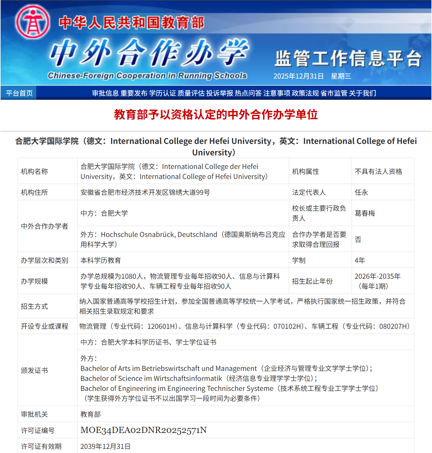 近日,教育部公布中外合作办学机构和项目审批结果,我校与德国奥斯纳布吕克应用科学大学合作举办的合肥大学国际学院获批成立,标志着安徽省第二家中外合作办学机构正式落户我校。这既是学校服务国家教育对外开放战略、聚焦安徽省新能源汽车产业链人才需求的重要里程碑,也是国际交流合作工作贯彻学校第一次党代会精神的历史性突破,更是学校国际化办学征程中的标志性成果。