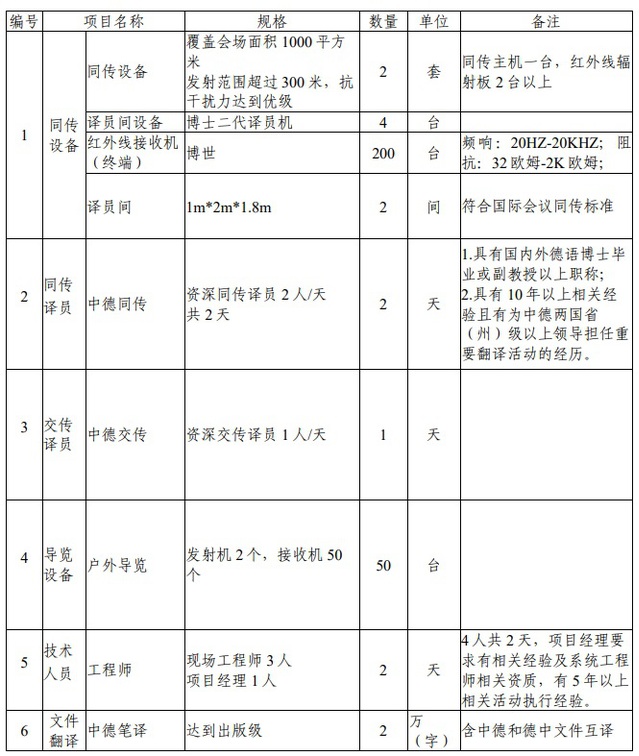 (1)提供研讨会同声传译保障服务(包含同传设备线下200人、中德同传译员2人等);(2)提供会场外交流活动的口译服务(包含户外导览设备50套及中德译员1人);