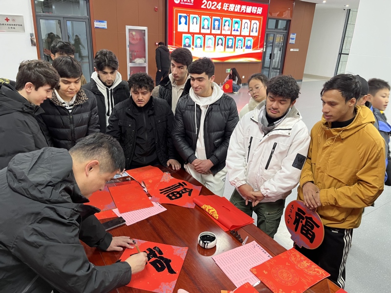国际教育学院的留学生们好奇地询问“马到成功”、“龙马精神”等吉祥话语的寓意,认真聆听“福”字承载的美好期盼,在轻松的互动中感受中国年俗文化的深厚底蕴。活动最后,每位留学生都收获了著名书法家亲手书写的福字和春联,满载而归。来自塔吉克斯坦的留学生阿里兴奋地展示他收到的福字:“我要把它贴在我宿舍门上,还要拍照片发给家人,让他们也感受中国新年的喜庆!”