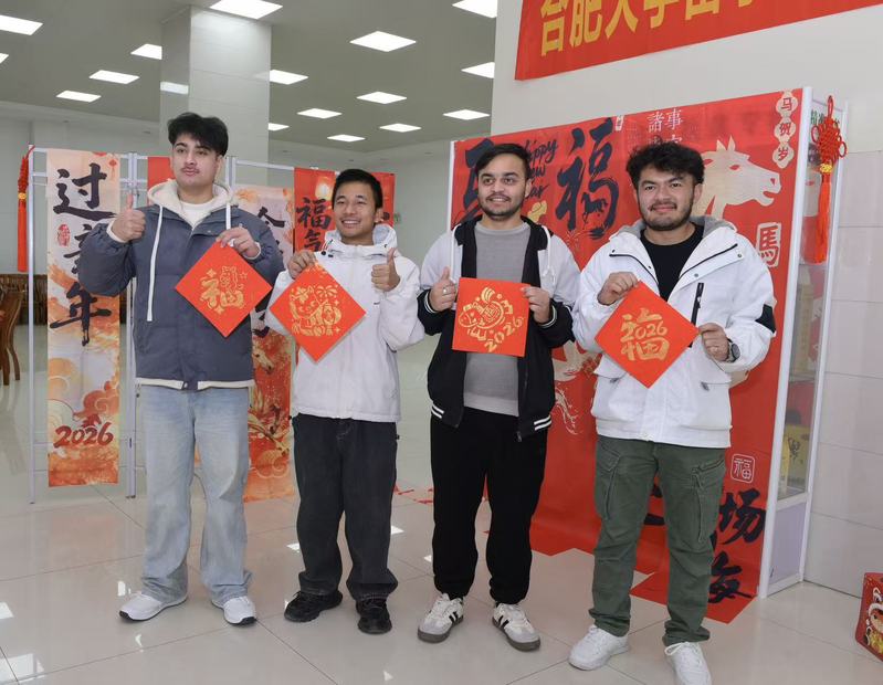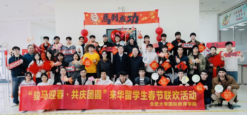 2026年2月10日,合肥大学二期教职工食堂内暖意融融、年味十足,一场温馨热闹的留学生新春联欢活动在这里隆重举行。活动现场红灯笼、中国结、骏马图案的装饰将大厅装扮得年味十足,洋溢着喜庆祥和的节日气氛。校党委委员、副校长王晓峰,国际教育学院院长王永军,直属党支部书记罗佳及教师代表与来自多个国家的近30名留校国际学生齐聚一堂,通过拓福字、扎鱼灯、绘漆扇、捏圆子等传统民俗体验,沉浸式感受中国春节文化魅力,共同欢庆马年新春的到来。
