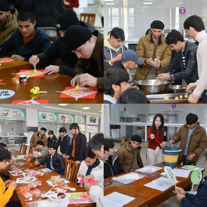 今年的新春联欢活动,国际教育学院精心设计和组织了非遗项目文化体验环节。活动现场以“情系华夏深感文化魅力”为主题,设置了四大非遗体验区:拓福字工坊环节,留学生手持拓印工具,在红笺上印制金边“福”字,领悟“福气临门”的团圆寓意;扎鱼灯工坊环节,师生共同合作扎制鲤鱼灯,以竹篾为骨、纱纸为鳞,模拟“鱼跃龙门”的灵动姿态,象征着“年年有余”的丰饶祝福;绘漆扇工坊环节,留学生将印有梅花、竹叶的扇面浸入颜料桶中着色,感受着中国书画艺术的意境之美;捏圆子工坊环节,留学生们揉捏糯米团,通过“搓圆祈福”,体会“阖家团圆”文化中和谐包容的深层内涵。