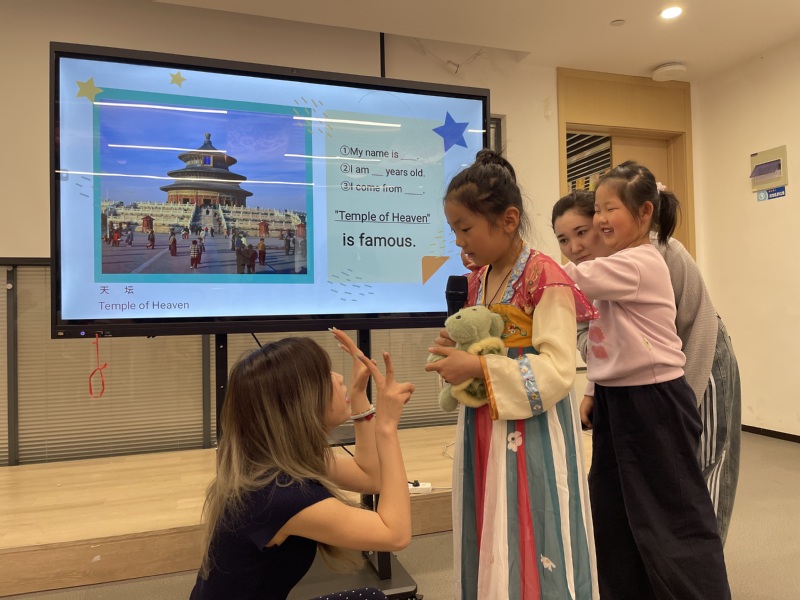 活动现场,八位来华留学生化身文化传播使者,以世界经典建筑为文化叙事核心,依托自身国别文化底蕴与语言优势,打造沉浸式、互动式文化科普课堂。授课过程中,留学生们兼顾低龄儿童认知特点,采用“简易中文辅以常用英文”的双语通俗宣讲模式,搭配直观生动的世界建筑实景图文素材,细致拆解埃菲尔铁塔等全球地标建筑的建造特色、人文底蕴与地域文化内涵。鲜活的讲解表达、趣味的文化科普,让孩子们在轻松欢快的氛围中零距离接触异国风情,潜移默化夯实基础英语认知,拓宽全球文化视野,种下文明互鉴的小小种子。文化宣讲过后,留学生们变身专属“外籍小老师”,聚焦基础英语口语表达开展针对性教学指导。通过核心句式领读、互动跟读练习、一对一耐心纠音等多元环节,循序渐进引导孩子们大胆开口、主动表达。现场多名孩子踊跃登台,自信用英语自我介绍,并倾情推介长城等中国标志性文旅地标,以少年之声讲述中国故事。
