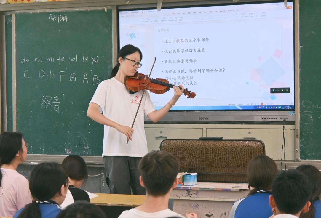 与此同时,“小提琴艺术鉴赏”课堂上,悠扬的琴声回荡。团队成员从基础乐理知识讲起,通过示范演奏和趣味互动,让学生们感受小提琴的魅力。学生们还参与了模仿演奏和音乐知识问答,课堂氛围活跃。