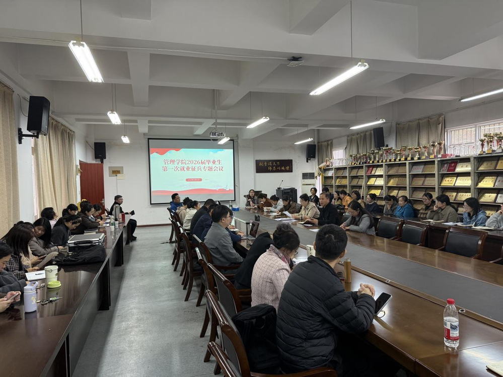 为深入贯彻落实学校就业征兵工作部署,全面推进毕业生高质量充分就业,10月21日下午,管理学院在6栋二楼会议室召开2026届毕业生就业征兵动员会。学院领导班子、各系主任、专业教师及毕业班辅导员参会,会议由院党委书记刘金平主持。 会上,院党委副书记徐娴首先传达学校2026届毕业生就业征兵工作总体部署和要求,对学院目前就业征兵工作开展情况做了简要介绍。她指出,就业工作是系统工程,全院上下要统筹谋划、通力配合。学院已建立领导分专业包保责任制,“一生一册”建台账,实施分类精准指导。下一步还将积极访企拓岗,举办专场双选会和征兵宣讲,拓宽就业渠道方式,提升就业精准度。 院长宋玉军在讲话中指出,招生、培养、就业相辅相成、互相影响,必须举全院之力“开源拓岗”。他要求各系、各团队迅速行动,内外结合,多方位多渠道挖掘更多高质量岗位。他特别强调“校友是最大资源”,要建立校友企业招聘绿色通道。 最后,刘金平作总结讲话。她指出,2026届全国毕业生预计达1250万人,增量与结构性矛盾叠加,就业形势异常严峻。要把就业育人融入思政教育,引导学生树立正确择业观。她号召毕业生积极投身“三支一扶”“西部计划”“特岗计划”等基层项目,踊跃报名参军,把青春写在乡村振兴、国防建设和新质生产力发展的火热实践中。她还强调,要持续完善帮扶机制,对脱贫家庭、零就业家庭等困难学生落实“一人一策”,结对重点帮扶。