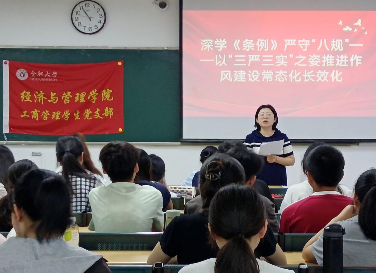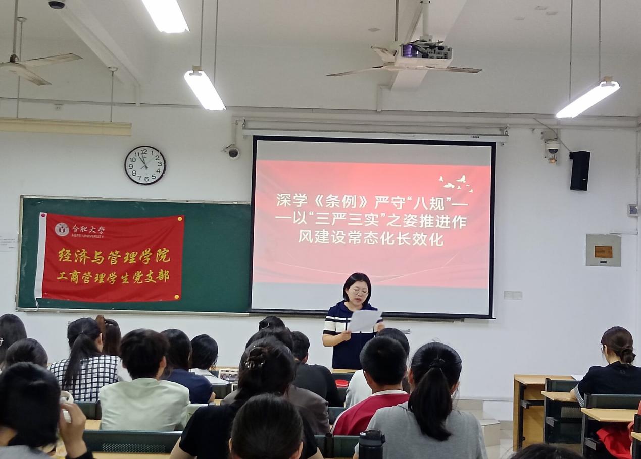 6月26日,经济与管理学院工商管理学生党支部在一期4栋101教室开展深学《条例》严守“八规”----以“三严三实”之姿推进作风建设常态化长效化主题党课,由经济与管理学院工商管理学生党支部书记姚璇老师主讲,支部全体党员共同参加。