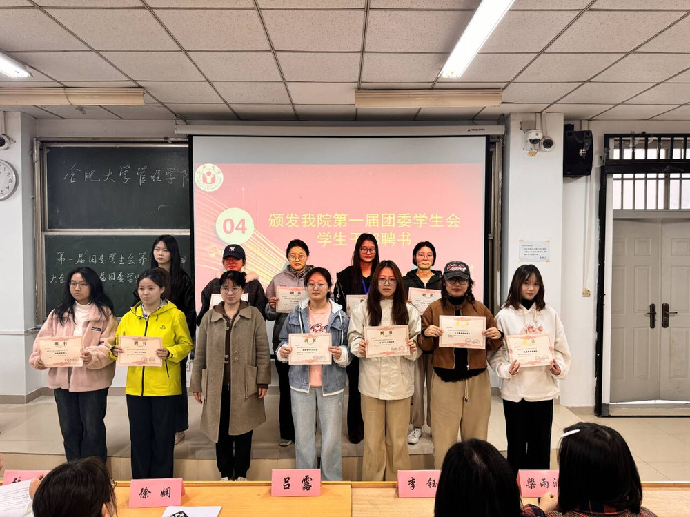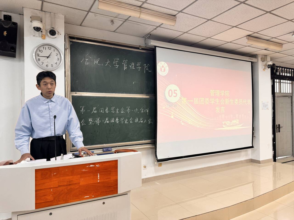 为进一步加强学生会组织建设,传承服务奉献精神,凝聚青春力量,2025年11月6号中午,管理学院第一届团委学生会第一次全体大会暨第一届团委学生会换届大会顺利召开。管理学院党委副书记徐娴、团委负责人吕露出席,学生会全体成员参加了本次会议。会议由管理学院学生会委员胡亚男主持。 大会伊始,全体参会人员奏唱中国共产主义青年团团歌。激昂的旋律凝聚青春力量,嘹亮的歌声传递责任担当,为本次换届大会拉开序幕。