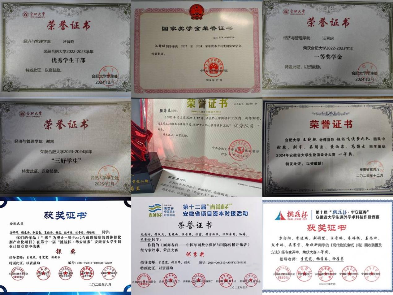 学习上,她们勤勉笃学,锐意进取。寝室长汪晋昭同学担任班长、辅导员助理,连续两年综合测评位列班级第一,获国家奖学金、校级一等奖学金,更以“优秀学生干部”“三好学生”“优秀团员”等称号印证全面发展之路,她积极参加学科竞赛并获得省奖十余项、校奖二十余项,学习上认真刻苦,思想上积极向上,工作上严谨负责。谢然同学在班级担任学习委员,曾任南艳青年新媒体中心主编,在学科竞赛中斩获安徽省物流设计大赛一等奖,获校二等奖学金、三好学生、优秀团员等荣誉称号,秉持着谦逊的态度,通过不懈的努力不断进步。强若兰同学作为班级生活委员,秉持着高度的责任心,细致入微地处理班级各项事务。在学校国旗护卫队中,她凭借日复一日刻苦训练磨砺出的过硬素质,从众多队员中脱颖而出,担任副班长一职。训练时,不仅严于律己,更主动帮助新队员纠正动作、讲解要领,以专业的指导和耐心的态度赢得队员一致认可,获评“优秀教员”称号。此外,她在各项任务中始终冲锋在前,以出色表现荣获“优秀个人”表彰,成为校园里践行爱国精神与责任担当的榜样。