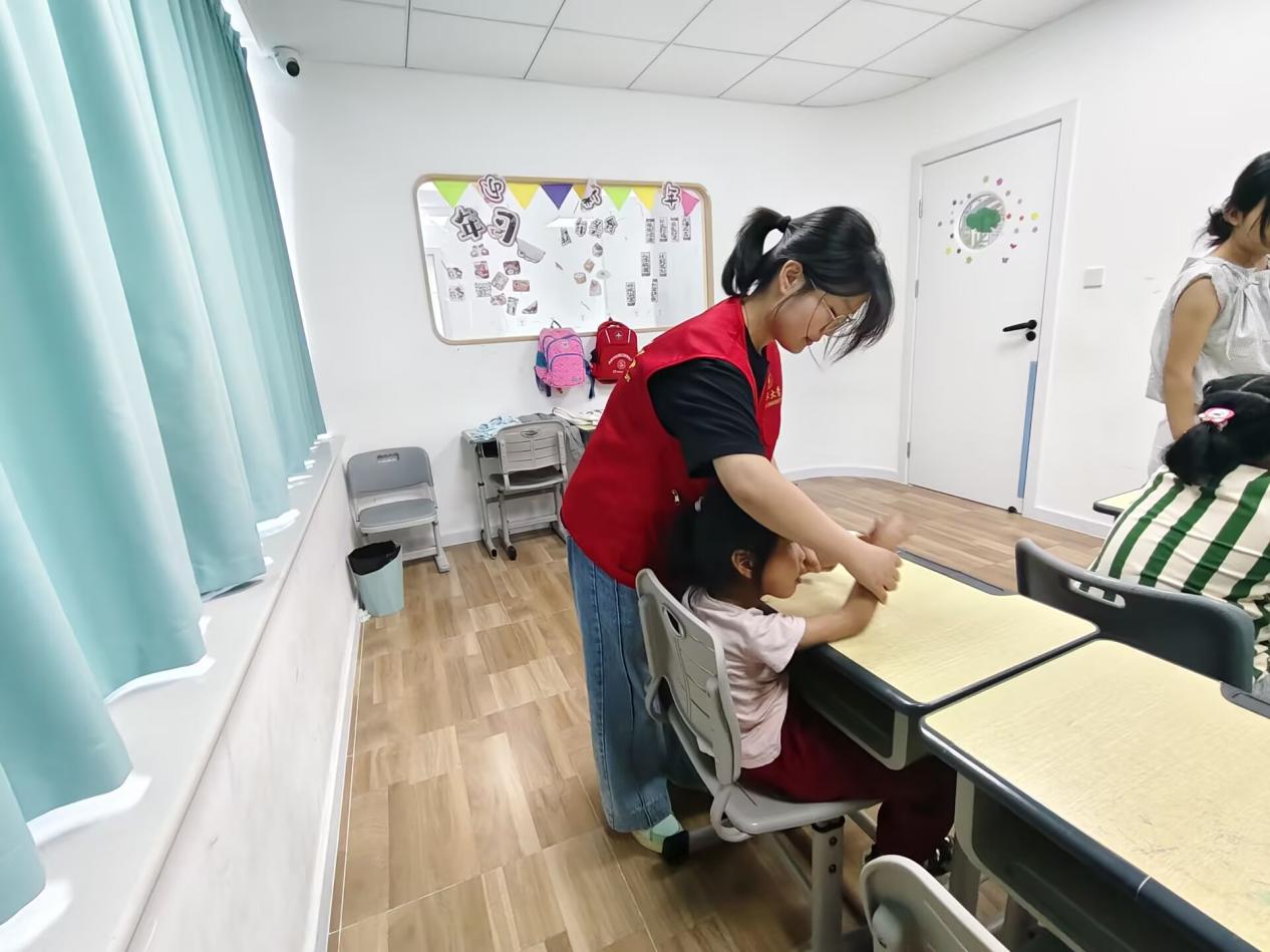 在园长的精心安排下,志愿者们迅速分组融入各个班级,全力协助教师展开多样课程,为孩子们送去贴心陪伴与耐心引导。在生活自理课的教室里,老师细心地示范着削黄瓜的步骤,小朋友们好奇又专注地围观。随后,在志愿者们温柔的鼓励与手把手的帮助下,每一位小朋友都鼓起勇气尝试削皮。他们神情专注,动作从生疏到熟练,最终都成功完成了任务,脸上洋溢着自豪的笑容。专注力训练课上,志愿者们与教师默契配合,将五彩斑斓的织布玩具逐一发放到孩子们手中。在志愿者的轻声引导下,小朋友们认真地拿起一条条布线,小心翼翼地穿过一个个小洞洞。这看似简单的动作,实则在潜移默化中锻炼着他们细腻的手眼协调能力,也让孩子们逐渐沉浸在这专注的创作时光中。体育课更是热闹非凡,小朋友们围坐在一起,进行着套圈传递游戏。他们互相递传圈圈,欢声笑语回荡在校园里,在欢快的氛围中,孩子们的合作能力和动手能力都得到了有效提升。