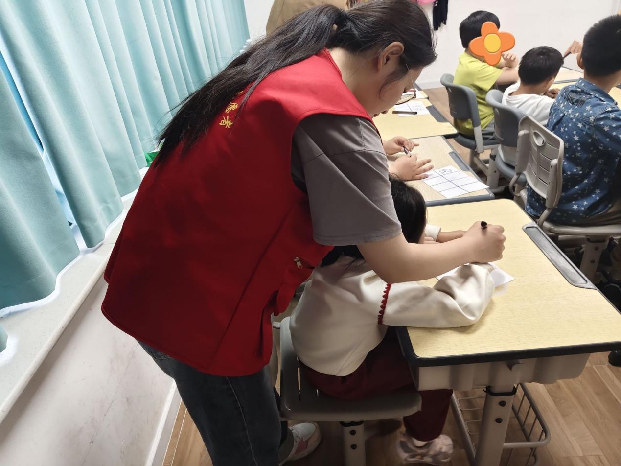 在园长的精心安排下,四位志愿者迅速融入不同班级,全力协助老师开展教学活动,展现出积极昂扬的精神风貌与高度的责任意识。在生活自理课上,他们化身耐心细致的“小助手”,辅助老师引导孩子们学习套鞋套、识别上衣并夹卡片等技能。从示范动作到手把手教导,每一个步骤都饱含着对孩子们的关爱,旨在锻炼孩子们的动手与认知能力,帮助他们逐步迈向独立自主。专注力锻炼课上,志愿者们更是化身“细心守护者”。孩子们在裁剪卡纸、卷手环的过程中,他们不仅时刻关注着孩子们的操作是否沿提示线进行,给予及时引导,还高度警惕,防止意外发生,确保整个活动安全有序开展。他们用无微不至的关怀为孩子们营造了一个充满安全感的学习环境。