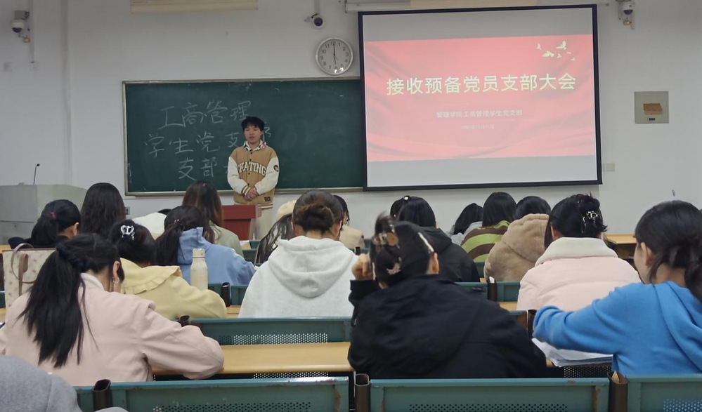 2025年11月11日,管理学院工商管理学生党支部在6-101室召开党员大会暨接收预备党员支部大会。 会议伊始,刘丹青书记带领支部全体党员深入学习领会党的二十届四中全会精神,强调全体党员要筑牢思想根基,坚定政治立场,发挥模范带头作用。