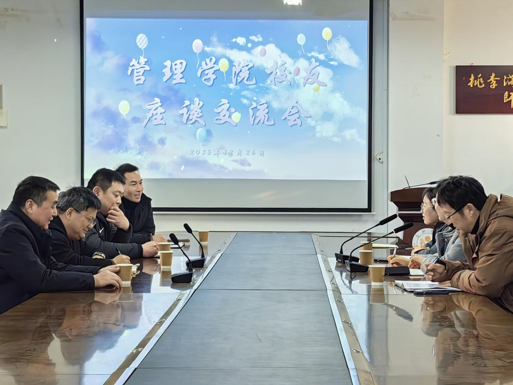 12月26日下午,管理学院在学院会议室召开校友座谈会,04级信息管理与信息系统专业胡坤、07级工商管理专业沈岩以及09级物流管理专业裴杨三位校友重返母校,与老师们共叙情谊、共话发展。校机关党委书记缪群道、学院党委书记刘金平、党委副书记徐娴、殷辉教授以及校友联络员余宏强参加座谈。
