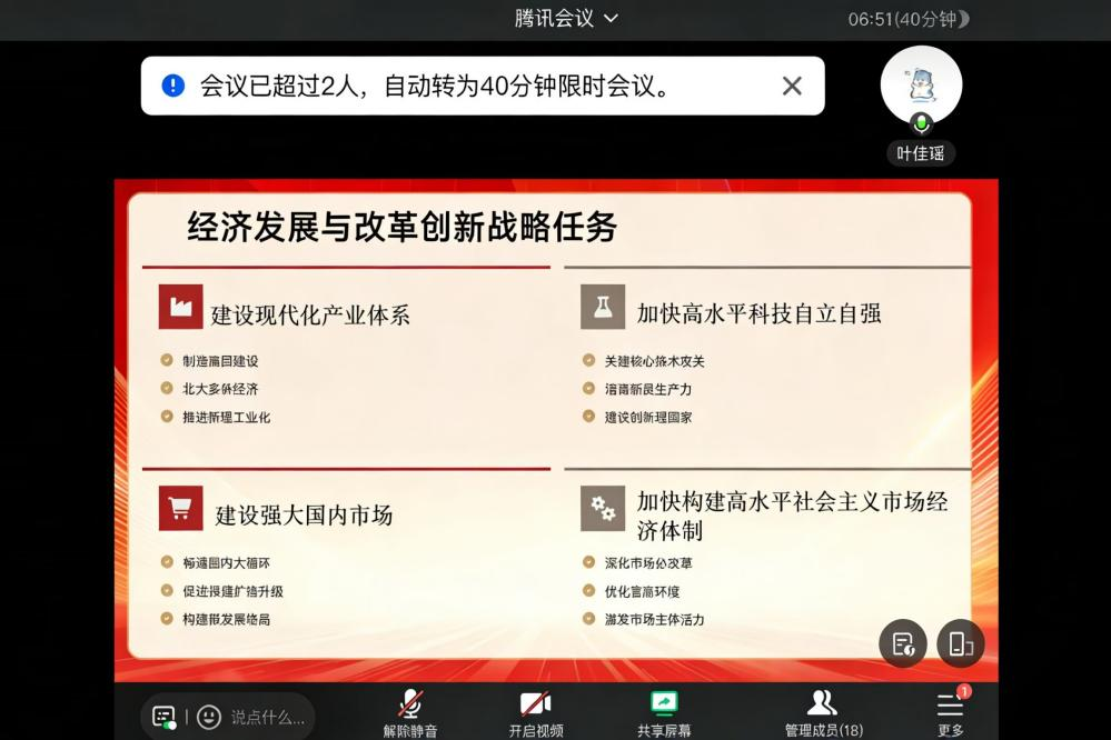 为深入学习贯彻党的二十届四中全会精神,2026年1月6日,合肥大学会计学学生党支部组织全体党员开展了党的二十届四中全会精神学习线上宣讲交流会。本次宣讲会由学校党的二十届四中全会精神宣讲团成员叶佳瑶担任主讲。 叶佳瑶以“二十届四中全会精神核心要点”为主题,系统梳理了全会召开的基本情况,深入阐释了“十五五”经济社会发展的指导思想、基本原则、主要目标、战略任务和根本保证,并结合高等教育使命,从学生的角度对全会精神进行了深入解读。