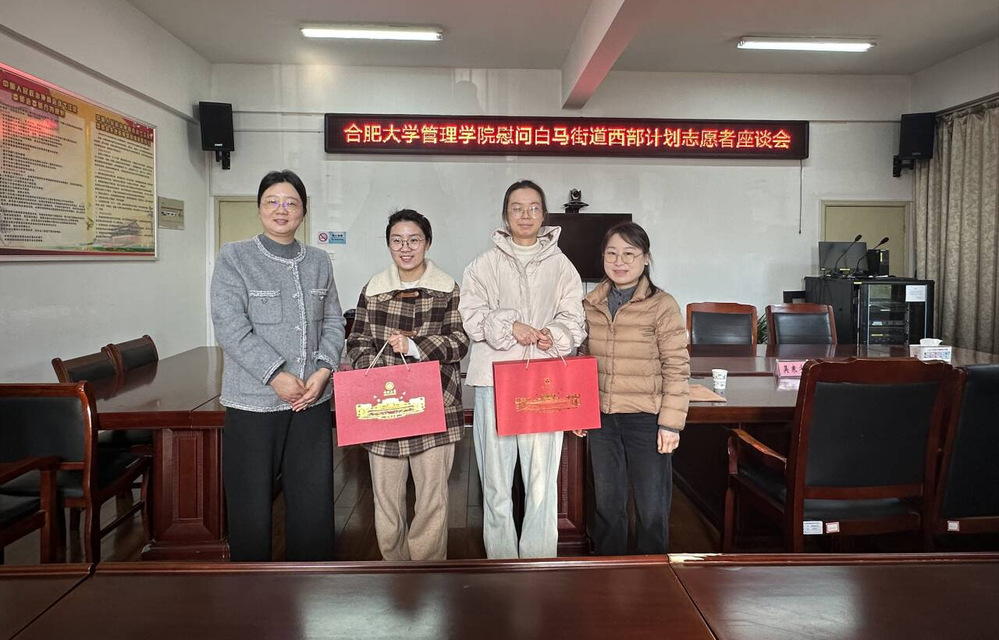 为切实做好西部计划志愿者的关心和服务工作,1月16日,管理学院党委书记刘金平、党委副书记徐娴一行前往芜湖弋江区白马街道,慰问管理学院毕业生、西部计划志愿者方媛和吴寒宇。白马街道办事处组织、宣传、统战委员赵兰春,团工委副书记郭梦婷予以热情接待。 学院一行细致深入了解志愿者们的岗位职责、工作学习、生活适应等情况,并送上团委纪念品,向她们表达学院的问候与关怀。交流中,赵兰春对我校毕业生给予高度赞扬,称她们工作认真负责、踏实肯干,很好地完成了各项工作任务。 方媛和吴寒宇各自分享了在基层工作的心得体会和成长收获。她们表示,学院的慰问和关怀让她们倍感温暖,今后将继续坚守初心,立足岗位、勇担责任,为地方发展贡献智慧和力量。