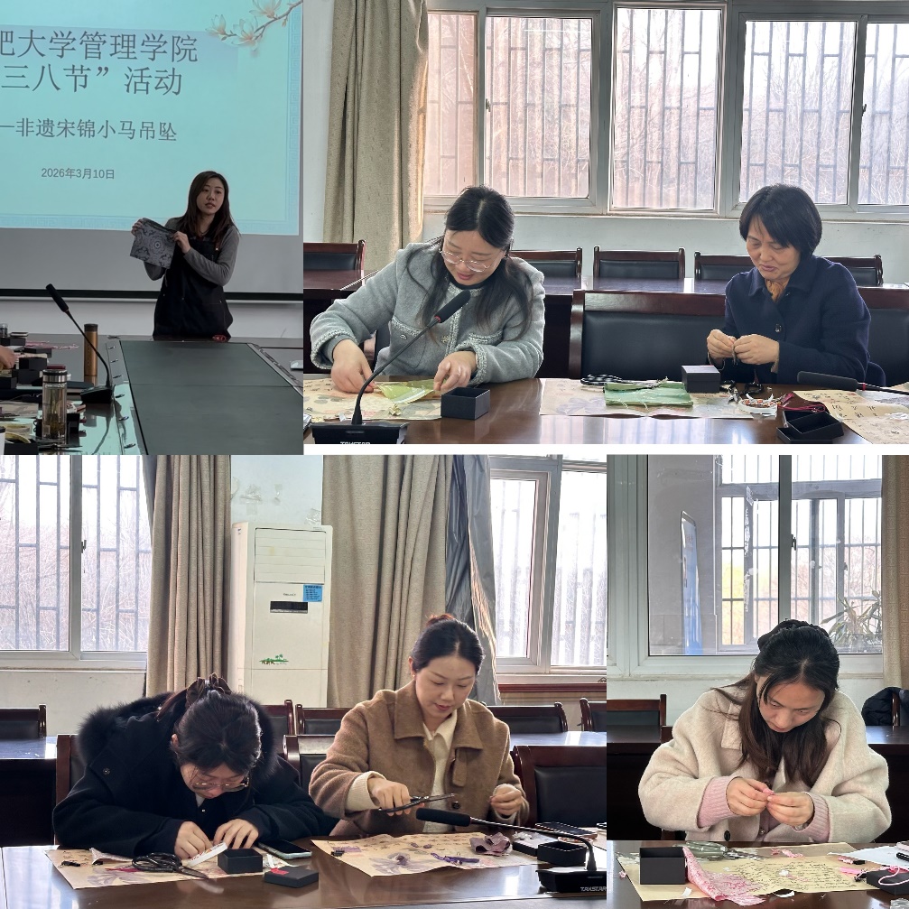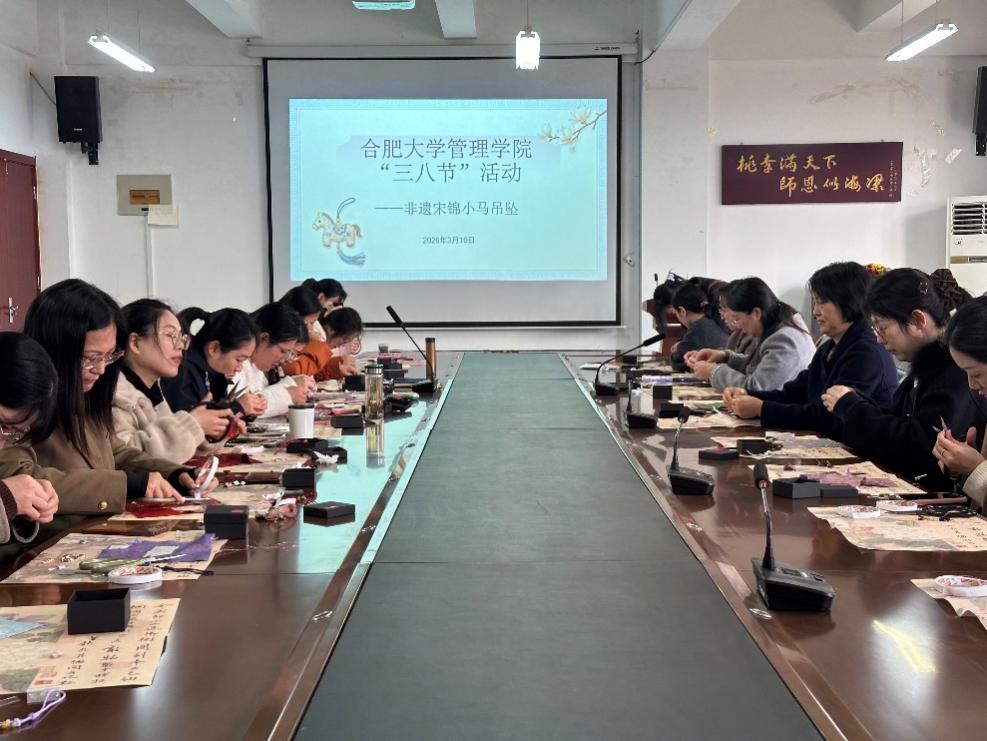 为庆祝第116个“三八”国际妇女节,弘扬中华优秀传统文化,彰显新时代女性风采,2026年3月10日下午,合肥大学管理学院分工会举办了一场以“巧手传情 巾帼添彩”为主题的宋锦小马吊坠非遗手作体验活动。女教职工们欢聚一堂,在指尖流转中感受宋锦非遗技艺的精湛魅力,共度了一个温馨而有意义的节日。 在专业手工艺老师的悉心指导下,女教职工们深入了解了宋锦这一“锦绣之冠”的历史渊源、工艺特色及文化内涵。随后,大家纷纷动手,挑选各色精美的宋锦布片,学习裁剪、折叠等步骤,巧手翻飞,将原本零散的锦片与配件逐步塑造成一匹匹造型灵动、色彩典雅、寓意吉祥的“宋锦小马”吊坠。 大家或交流心得,或互相欣赏作品,在专注的创作中体验传统手工艺的匠心与温度,也将对新春的祝福、对未来的期盼融入这小小的手作之中。 本次活动丰富了女教职工的精神文化生活,让她们在繁忙工作之余,能够近距离接触、体验中华优秀传统文化的独特魅力。通过亲手创作,不仅放松了身心,更增强了文化自信和团队凝聚力。未来,学院将持续创新活动形式,营造更加温暖、和谐、积极向上的工作氛围,激励全体教职工,特别是巾帼力量,以更加饱满的热情和务实的行动,为学院和学校的高质量发展贡献智慧与力量,在新征程上书写更加精彩的篇章。