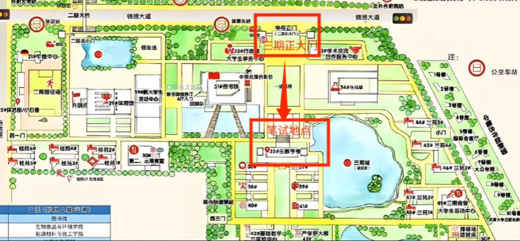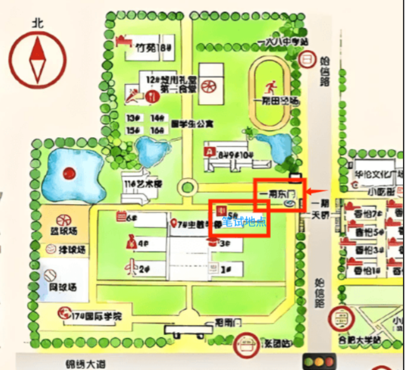 图 1 一期校园地图 (二)面试地点:合肥大学三期校区 35 栋 7 楼(合肥市经济技术开发区锦绣大道99号) 1.入校通道:考生进校持纸质版准考证从合肥大学三期锦绣大道正大门入校; 2.路线指引: 三期主大门南侧即为 35栋教学楼,考生入校后沿主干道直行即可看到 35栋教学楼(红色箭头指向),到候考室705候考。