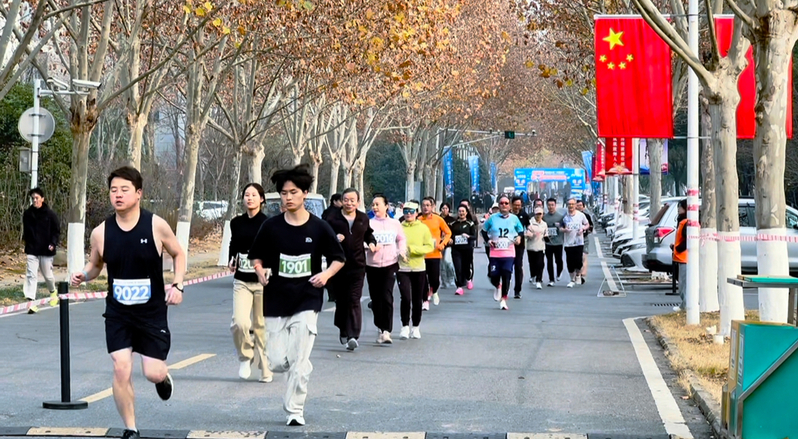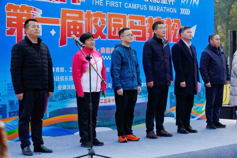 开幕式上,校党委副书记、校长任永,校党委委员、副校长王晓峰以及相关部门负责人亲临现场,为马拉松赛事加油助威。副校长王晓峰在致辞中表示,校园马拉松不仅是体育竞技的舞台,更是培养师生坚韧意志和团队精神的载体。他鼓励参赛师生以饱满的热情投入比赛,在奔跑中感受青春的活力,为新的一年注入正能量。随后,校长任永宣布:“合肥大学第一届校园马拉松开跑!”随着发令声响,约300名师生参赛者如离弦之箭冲出起点,沿着校园精心规划的路线展开角逐,他们身着参赛服,奔跑在风景如画的校园赛道上,用脚步丈量青春热土,用汗水书写拼搏篇章,成为冬日校园里一道最亮丽的风景线。赛道两旁,啦啦队呐喊助威,气氛热烈。参赛者中既有教师代表,也有学生团队,他们以奔跑诠释坚持,用汗水书写团结,共同迎接2026年的曙光。