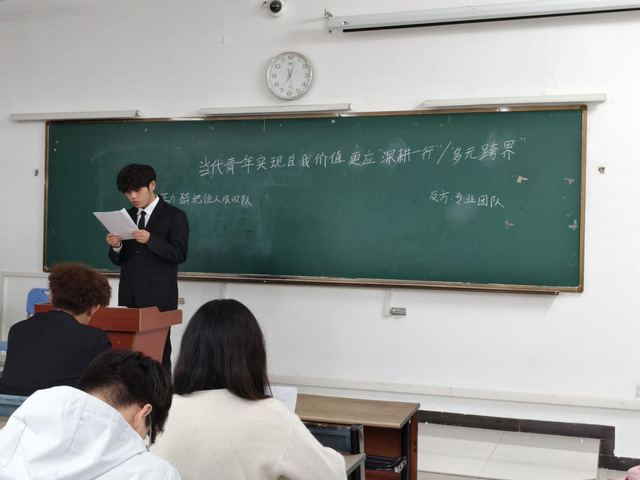 10月30日19:00,合肥大学35栋教学楼内掌声阵阵,由能化学院学生会学权部主办的辩论赛决赛正式开始。正方“醉把佳人成双队”与反方“专业团队”两支劲旅,围绕“当代青年实现自我价值更应‘深耕一行’还是‘多元跨界’”这一直击青年成长困惑的辩题,上演了一场酣畅淋漓的思维对决。