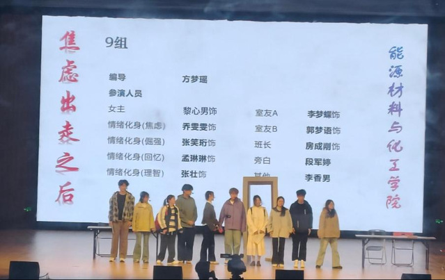 11月25日下午,校园心理情景剧大赛在新大学生活动中心二楼礼堂举行,能源材料与化工学院出品的心理剧《焦虑出走之后》以95.33的高分斩获一等奖,参赛人员包括方梦瑶、黎心男、乔雯雯、房成刚、孟琳琳、张壮、张笑珩、李梦蝶、郭梦语、段军婷、李香男。