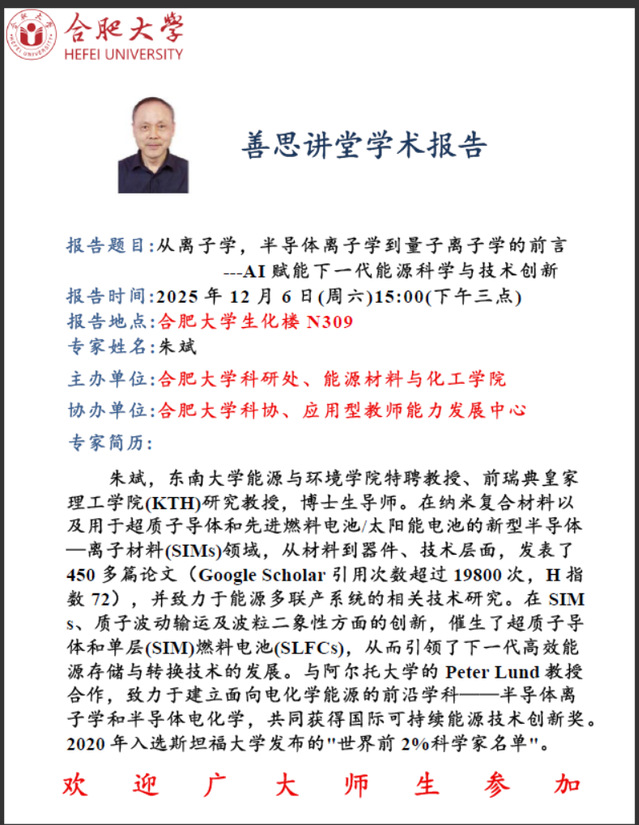 [学术报告]从离子学,半导体离子学到量子离子学的前言 AI赋能下一代能源科学与技术创新