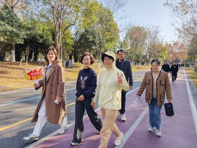 随后,老师们沿着公园景观步道稳步前行。沿途草木葱郁、景致宜人,教职工党员带头践行绿色低碳理念,与同事们或并肩畅谈,交流教学科研心得、生活趣事及党建学习感悟;或步履铿锵,享受健步走带来的身心放松,欢声笑语与秋日景致相映成趣,成为公园内一道靓丽的风景线。活动中,大家相互鼓劲、彼此陪伴,充分展现了党员先锋模范作用和全院教职工团结协作、积极向上的精神风貌。