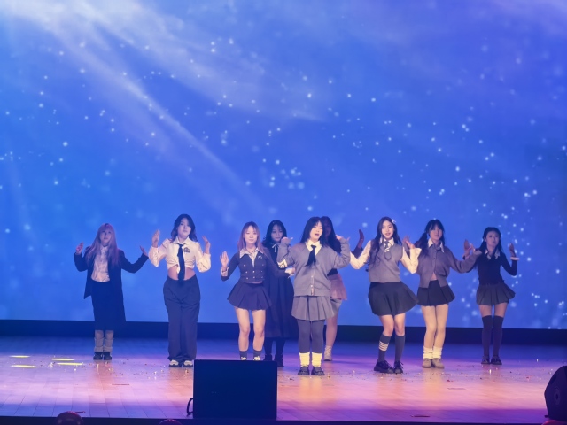 相较于第一幕的温婉抒情,晚会第二幕的旋律与节奏更富层次,以多元表演点燃全场热情。姜思萌、王钰庆、陈浈极、高雅雯等表演者带来的模特走秀率先登场,瞬间引爆气氛。表演者们身着金属质感亮片服饰,手持创意道具,在“蓝色科技感几何图案”的舞台背景下踏出飒爽台步,利落的身姿与富有设计感的造型相得益彰,每一次转身、每一个定格都引来台下阵阵欢呼,现场热度瞬间拉满。走秀结束后,金涵以一首《落》为全场降温,却让情感更显绵长。她立于缀满粉色繁花的中式窗棂图案大屏前,婉转的歌声搭配雅致的舞台画面,将 “落花无言,人淡如菊”的意境缓缓铺陈,余韵悠长,让观众沉醉其中。随后,李蕤老师带来独舞《绒花》,以优美的肢体语言诠释歌曲的柔情与深意——抬手似花瓣轻颤,转身如流云漫卷,每一个动作都牵动着观众的心弦;紧接着,孙若茜身着金色流光长裙登台,以《我只在乎你》传递细腻情感,温柔的歌声如细流般淌入观众心田,不少师生随之轻哼,现场温情涌动。随后,郑鸣扬、张奥雪等演员带来的小品《万松书院》。舞台背景还原了古雅的书院场景,演员们身着古装演绎“反串版梁祝”:毕业之际的互诉衷肠、祝英台揭晓女儿身的波折、众人因香囊手帕引发的“争认女孩”诙谐情节,再加上先生“看破不说破”的通透、马文才“成人之美”的温情设定,既笑点密集又不失暖意,现场笑声与掌声此起彼伏。