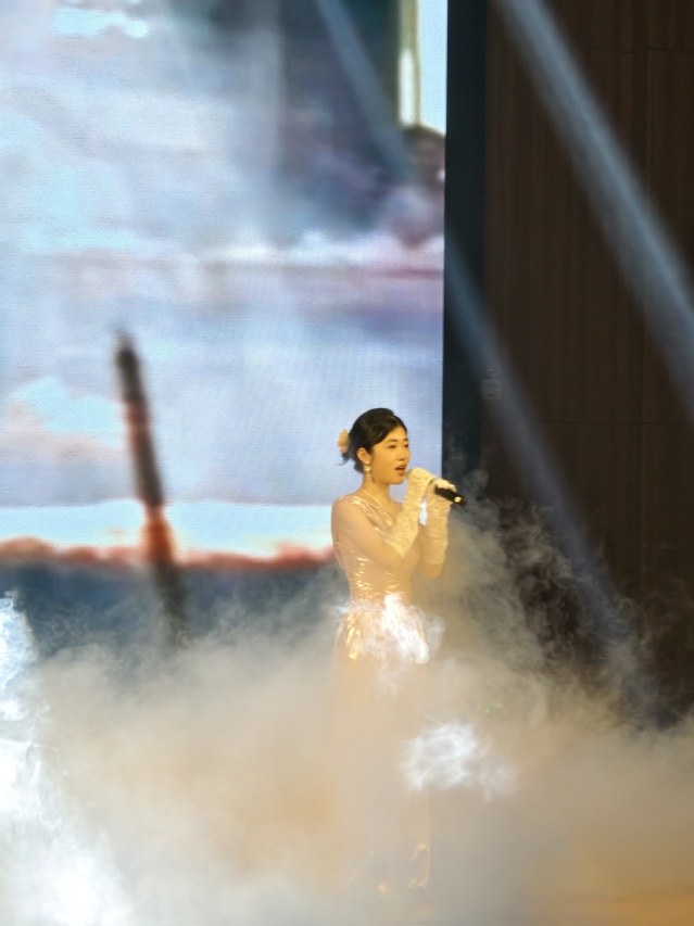 伴随着轻柔的音乐,晚会第一幕缓缓拉开帷幕。首先登场的是张梦珊、肖一遥带来的舞蹈与钢琴合奏《夜泊秦淮》。舞者身着典雅浅色长裙,在“帆影凌波”的舞台背景中翩跹,舞台轻烟袅袅,悠扬的钢琴旋律与灵动的舞姿相融相生,将秦淮夜色的温婉意境娓娓道来,让观众仿佛置身江南水乡。随后,胡诗琪怀抱木吉他登台,以一首《betty》点亮全场。她静坐舞台中央,背后大屏铺展着“红叶满街”的暖色调画面,温柔的嗓音如清风拂过会场,治愈感漫溢。紧接着,郑妍、叶昌栋带来男女对唱《爱错》。二人分别身着黑色亮片长裙与深色西装,在星光光束与舞台烟雾的交织中深情演绎,大屏上的歌词字幕随旋律轻跃,情感饱满的歌声直抵人心,将爱情里的遗憾与怅惘诠释得淋漓尽致。第一幕的压轴节目是张奥雪、王雨晨等演员带来的话剧《雷雨》节选。演员们身着贴合角色的服饰,在还原故事氛围的舞台背景下,精准把握人物情绪,将周朴园的虚伪、繁漪的挣扎、侍萍的隐忍展现得入木三分,紧凑的剧情节奏让观众沉浸式走入经典。