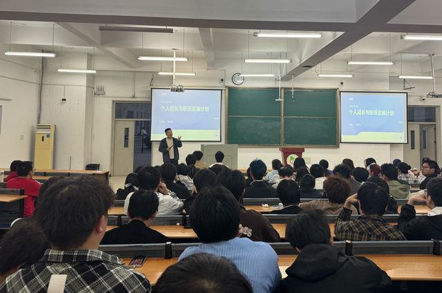 讲座中,蒋尚伟结合自身从校园到创业的成长经历,围绕职业性格测试、失败经历与成长、长期主义与乐观心态、人生规划、面试与简历技巧、职场问题解决能力等六个方面展开讲解。他特别设计了“猜猜哪个是假的”互动环节,分享了自己大学期间创业的真实经历,引导学生正视挫折、从失败中汲取成长动力。
