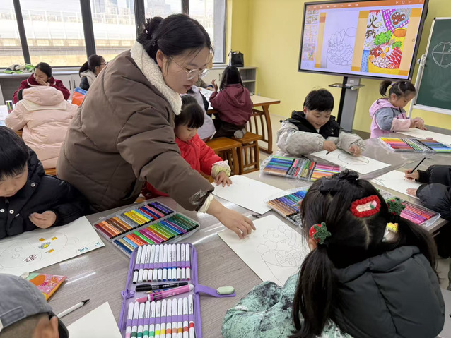 下午3时,美术课堂接续开展,另外两名志愿者准时到岗接手服务任务。志愿者提前对画纸、颜料、画笔等教学材料进行分类整理和摆放,确保分发工作高效有序。学员签到完毕后,志愿者按照教学需求逐一发放绘画材料,并协助教师完成课堂布置工作。教学期间,志愿者全程配合授课教师的教学安排,一方面做好后勤保障工作,及时为学员补充颜料、更换画笔等耗材;另一方面主动参与学员指导,与学员沟通创作思路,通过积极的鼓励性评价激发学员的创作积极性,保障了美术课堂教学活动的高效推进。