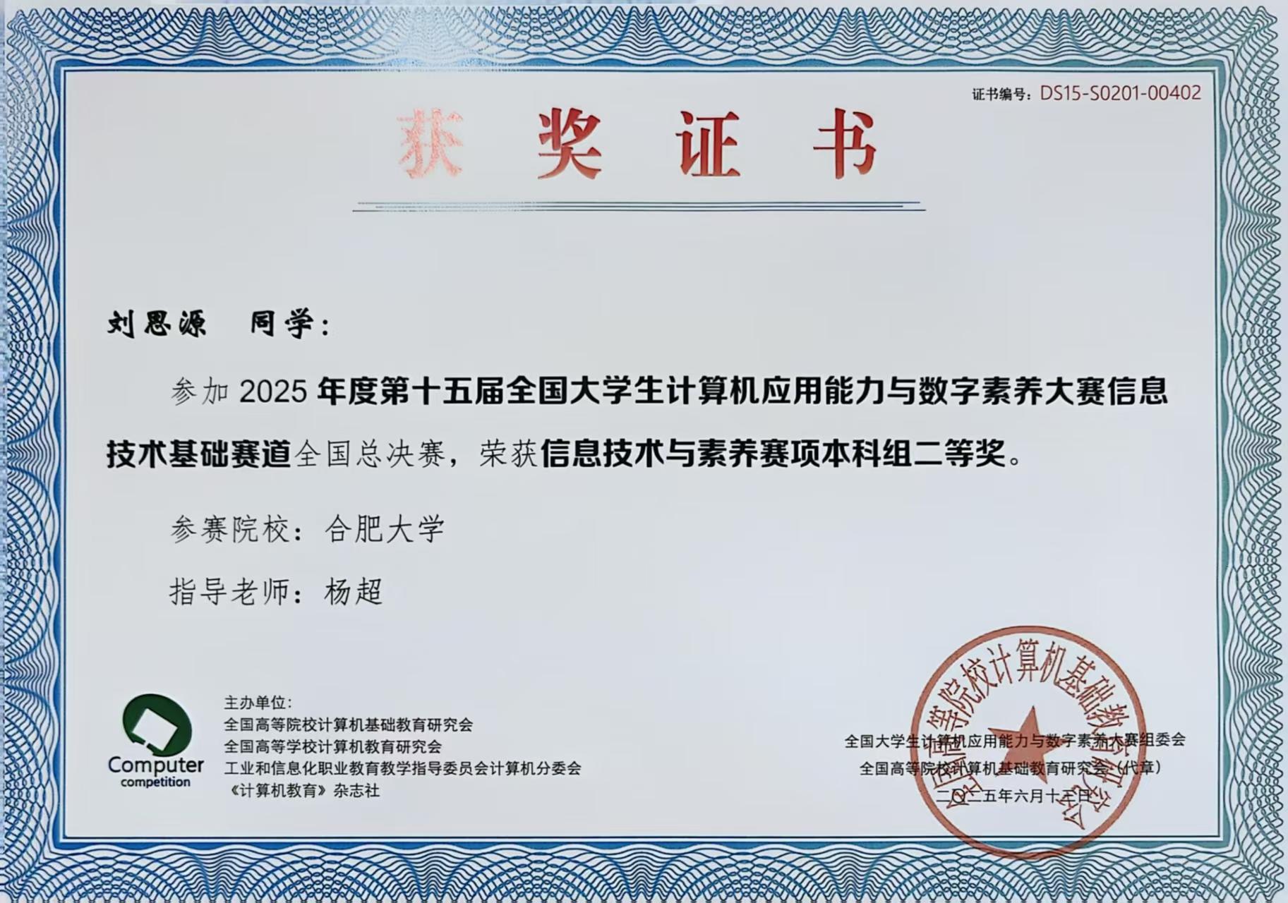 中心教师指导学生在第十五届全国大学生计算机应用能力与数字素养大赛信息技术基础赛道竞赛中荣获佳绩