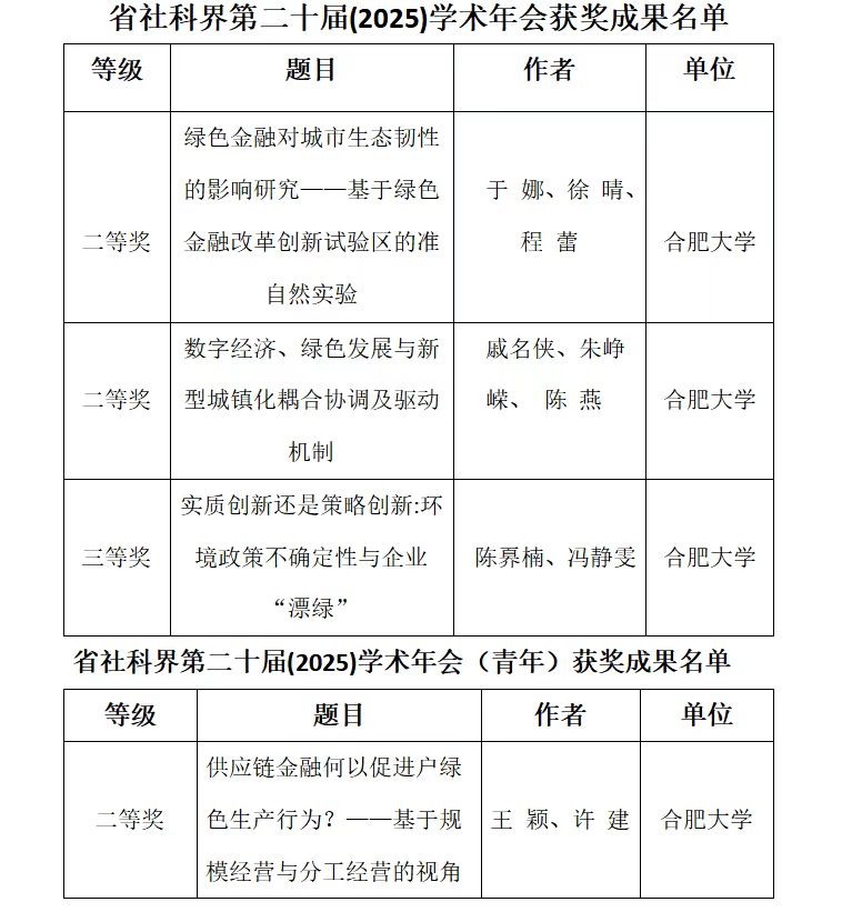近日,安徽省社科界第二十届(2025)学术年会拟获奖成果名单正式揭晓。我院师生表现突出,共有多项成果入选,其中,在一般奖项中,获二等奖2项、三等奖1项,在青年奖项中,获二等奖1项,展现了学校在哲学社会科学研究领域的扎实积累与创新活力。