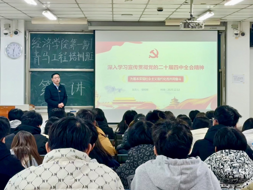 为深入学习宣传贯彻党的二十届四中全会精神,切实加强青年学子政治思想引领,12月12日中午,经济学院党委书记储昭辉给学院第一期“青马工程”培训班学员上课,学院团委负责人陈思超和培训班全体学员参加学习。
