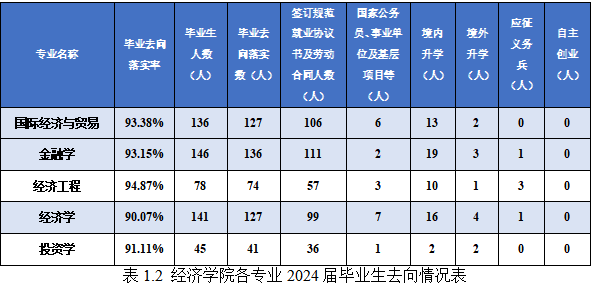 经济学院2024届毕业生中,共设有5个专业,分别国际经济与贸易、金融学、经济工程、经济学、投资学,各专业的主要就业情况如下: 国际经济与贸易专业毕业生人数为136人,毕业去向落实数为127人,毕业去向落实率为93.38%。其中,签订规范就业协议书及劳动合同人数为106人,国家公务员、事业单位及基层项目等为6人,境内升学为13人,境外升学为2人。 金融学专业毕业生人数为146人,毕业去向落实数为136人,毕业去向落实率为93.15%。其中,签订规范就业协议书及劳动合同人数为111人,国家公务员、事业单位及基层项目等为2人,境内升学为19人,境外升学为3人,应征义务兵为1人。 经济工程专业毕业生人数为78人,毕业去向落实数为74人,毕业去向落实率为94.87%。其中,签订规范就业协议书及劳动合同人数为57人,国家公务员、事业单位及基层项目等为3人,境内升学为10人,境外升学为1人,应征义务兵为3人。 经济学专业毕业生人数为141人,毕业去向落实数为127人,毕业去向落实率为90.07%。其中,签订规范就业协议书及劳动合同人数为99人,国家公务员、事业单位及基层项目等为7人,境内升学为16人,境外升学为4人,应征义务兵为1人。 投资学专业毕业生人数为45人,毕业去向落实数为41人,毕业去向落实率为91.11%。其中,签订规范就业协议书及劳动合同人数为36人,国家公务员、事业单位及基层项目等为1人,境内升学为2人,境外升学为2人。 三、经济学院各专业毕业生升学就业案例 唐家明,男,毕业于合肥大学经济与管理学院2024届金融学专业,现服役于陆军81集团军某旅。在校期间,他积极参与各类社会实践活动,团结同学、尊敬师长。毕业后,唐家明面临着多种职业选择,但他最终决定应征入伍。唐家明认为部队是一个锻炼意志、提升自我的绝佳平台,他希望通过军旅生涯来磨炼自己的意志品质,增强团队合作能力,并为国家的国防事业贡献一份力量。通过军旅生涯,唐家明不仅锻炼了强健的体魄和坚韧的意志,还学会了如何在高压环境下保持冷静和高效。他深刻体会到团队合作的重要性,并对国家的国防事业有了更深刻的理解。唐家明表示,部队的经历将是他人生中宝贵的财富,未来他将继续为国家的繁荣和稳定贡献自己的力量。