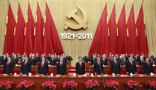 7月1日,庆祝中国共产党成立90周年大会在北京人民大会堂隆重举行。胡锦涛、吴邦国、温家宝、贾庆林、李长春、习近平、李克强、贺国强、周永康出席大会。新华社记者 鞠鹏 摄