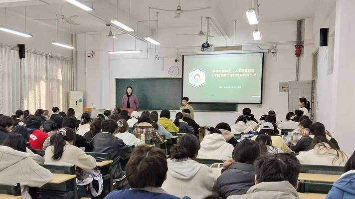 为增进小学教育专业学生对小学数学教学一线的了解,强化教学实践核心能力,11月26日下午2点30分,教育学院特邀合肥市青年路小学蔡敏校长与沈忱主任,于3栋教学楼107教室举办“小学数学课堂教学实践”专题讲座。讲座由陈芬萍教授主持,小学教育系主任贺云飞及2023级小学教育专业全体学生共同参加。