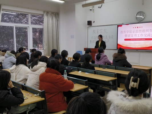 传革命薪火,展青春舞姿。为了发扬共青团精神,展现青年之志,12月19日下午4时,教育学院示范性组织生活会暨团支书工作交流会在三栋102教室顺利举行。教育学院团委副书记张弦乐、团委学生会兼职副书记屠厚辉、团委学生会兼职副书记李艾锦、各班级团支书以及21级应用心理学班全体同学参会,组织部部长朱思宇担任主持人。