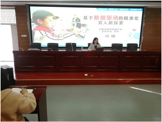 冯璐校长主要向师生们介绍了合肥师范附小聚焦五育并举视域下的学校评价改革、利用数字技术助力学校的课堂评价、学生综合素质个性化评价等方面做出的精准化育人新探索。重点探讨了为什么需要数据驱动“精准化育人”、 数据技术如何赋能日常学习、如何绘制个性化图谱驱动精准育人等三个方面问题。报告会得到了与会人员的高度赞同和认可。
