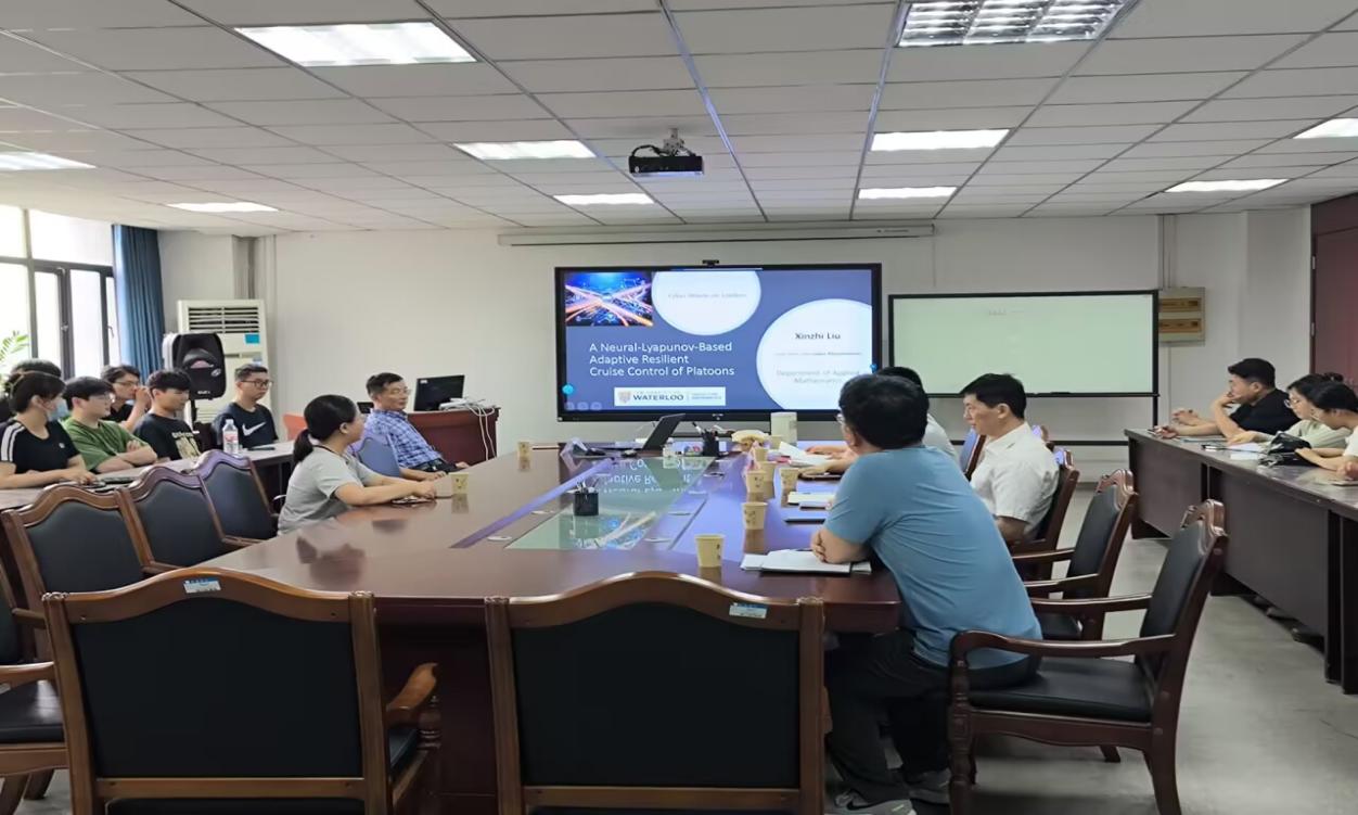 报告前,合肥大学校长任永教授亲切会见刘新芝教授,对学科专业建设、人才引进等方面做了简要交流。随后,在37号楼3楼305会议室,刘新芝教授为我院师生作了题为“Neural-Lyapunov-Based Adaptive Resilient Cruise Control of Platoons subject to Cyber-Attacks”的学术报告,报告由人工智能与大数据学院党委书记牛欣教授主持,科研处副处长王磊教授、数学与统计系和城市建设与交通学院相关专业教师与学生参加此次报告会。