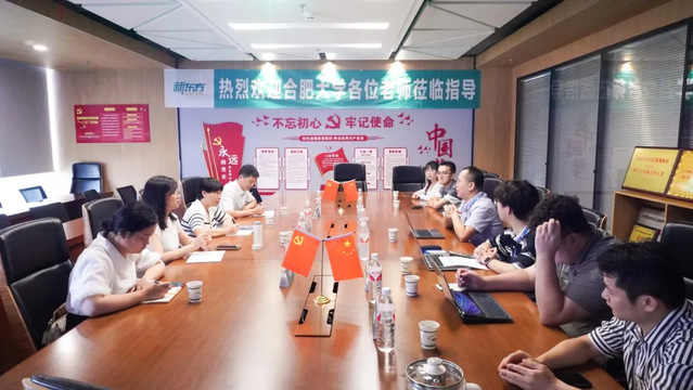 在新东方人力资源部佘嘉涛老师的引导下,合肥大学人工智能与大数据学院的老师们参观了新东方安徽总部大厦,并详细了解了新东方的学习机业务和文旅业务。通过宣传片的播放,与会人员对新东方集团的业务概况有了更加深入的了解。