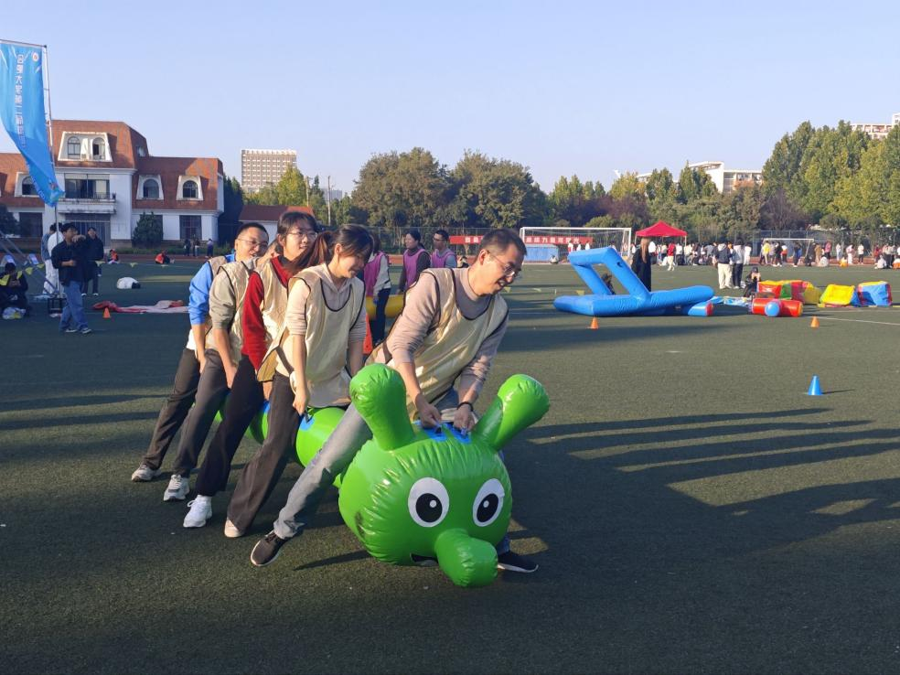 秋阳和煦,欢声雷动。平日里手持粉笔、循循善诱的教师们,今日在绿茵场上化身活力四射的“运动员”,迎来了一场别开生面的趣味运动会。赛场上,来自各学院的老师们全情投入,尽释放激情。“运动火炬”“步步高升”“俄罗斯方块”“同心协力”等项目中的默契配合与齐声呐喊,心手相连与精准协作,无一不淋漓尽致地展现了“快乐、协作、健康、团结”的趣味运动宗旨。老师们暂时放下教案与课件,灿烂的笑容与矫健的身姿共同编织成一幅幅生动活泼、温馨动人的画面。