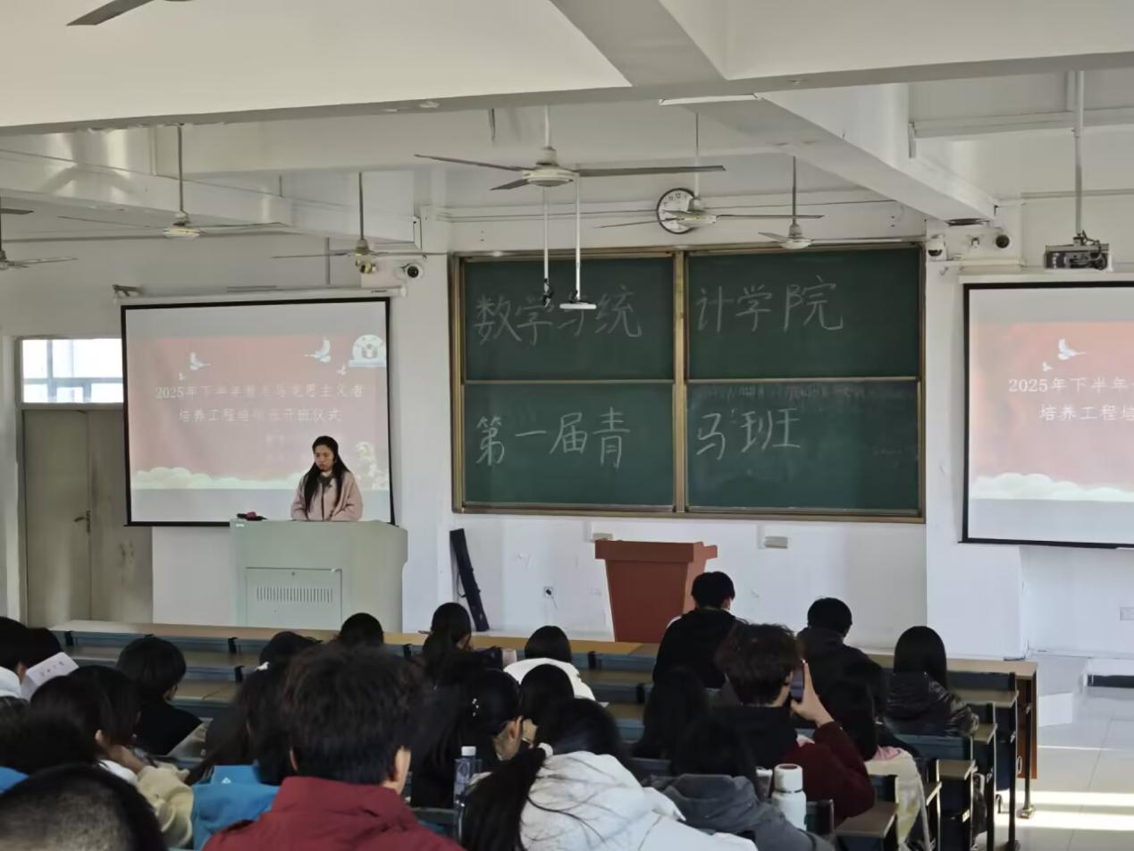 2025年12月5日中午,数学与统计学院首届青年马克思主义者培养工程培训班在37-2JT正式开班,学院全体团委学生会成员、25级新生班班委以及2025年下半年新发展团员参与此次培训。开班仪式由数学与统计学院党委副书记章云冉主持并进行授课,授课内容以“筑牢信仰之基 勇担时代使命”为主题,聚焦青年成长成才,在理论与实践相结合中锚定青年担当。