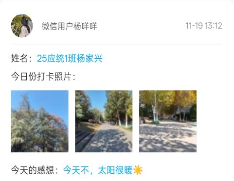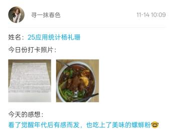 2025年11月4日至11月18日,数学与统计学院“向心而行·发现身边小确幸”15天打卡活动顺利举办,本次活动旨在引导大家留意日常温暖,缓解身心压力,在分享和记录中收获内心的治愈与力量。