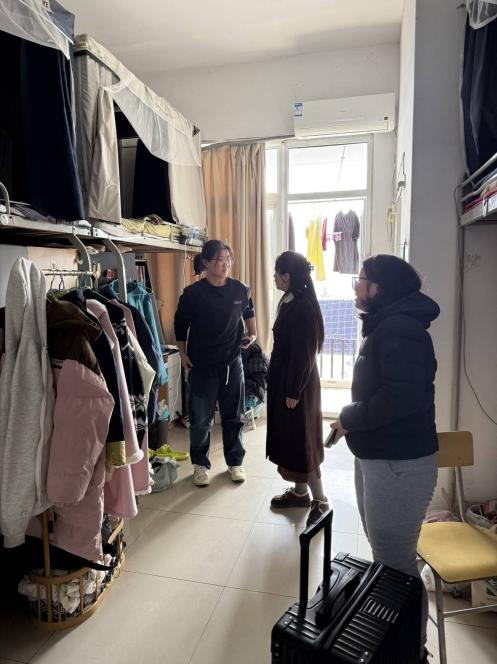 走访过程中,学院领导、辅导员老师与同学们亲切交谈,细致询问大家返校后的生活状况、学业规划及实际需求,叮嘱同学们尽快调整作息、适应校园生活,珍惜大学时光、勤奋求学。同时,重点对寝室卫生、用电安全、消防设施等情况进行全面检查,排查私拉电线、违规电器等安全隐患,对卫生不达标的寝室现场提醒整改,引导同学们养成整洁有序的生活习惯。