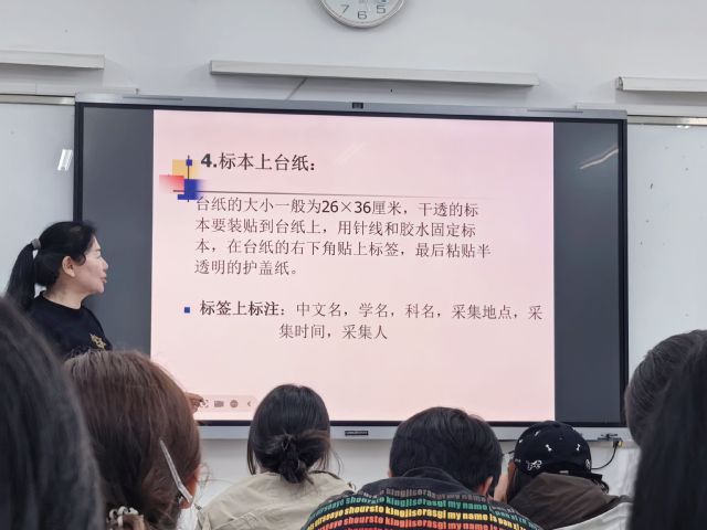 李蕤教授以诙谐幽默的风格,将专业知识与趣味案例相结合,从植物选材、标本制作实操到优秀作品解析,全方位为在场学子传授经验,现场氛围活跃,干货满满。在植物选材环节,她首先阐述了适用于制作标本的植物品类,详细介绍蕨类、银杏、万年藓、黑松等十余种植物的选材要点。在制作实操环节,她拆解腊叶标本及植物标本制作全流程,分享叶片展平、标本固定等技巧,同时提醒干燥处理、颜色保存等注意事项,还针对动物标本制作难点提炼针对性方法。在案例解析环节,李蕤教授展示大赛获奖作品,剖析构图创新、细节完整等出众之处,划定竞赛“红线准则”,并穿插“倔强叶片处理”等趣味实例调动氛围,精美标本图片更让学子沉浸式感受科学与自然之美。临近尾声,李蕤教授主动询问学子参赛课题,逐一解答“蕨类处理”等实际问题,提供精准解决方案。