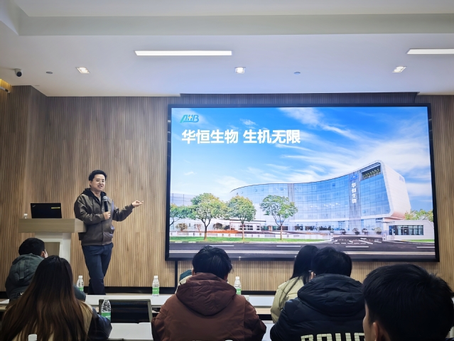 研究院参观结束后,同学们齐聚会议室,聆听了一堂专题企业文化课。企业相关负责人介绍了华恒公司企业的使命、愿景与核心价值观。 “发展生物技术,服务生命健康”——利用先进的生物制造技术,提供绿色、可持续的产品和解决方案,最终服务于人类健康和生活品质的提升,这与国家“双碳”战略和绿色产业发展方向高度契合。从实验室的严谨操作到生产线的工艺优化,都体现着对实效的追求。随后围绕“华恒奋斗史”这一主题,结合公司发展中的关键事件与人物故事,生动阐述了华恒生物“成就客户,开放共赢,创新卓越,奋斗为本”的核心价值观。课程不仅介绍了企业的战略规划与产品矩阵,更分享了华恒人在面对技术难关与市场挑战时展现出的坚韧不拔、勇于创新的精神风貌。企业发展与国家生物经济发展的同频共振,也让同学们对个人专业学习与国家产业需求之间的联系有了更深层次认识。