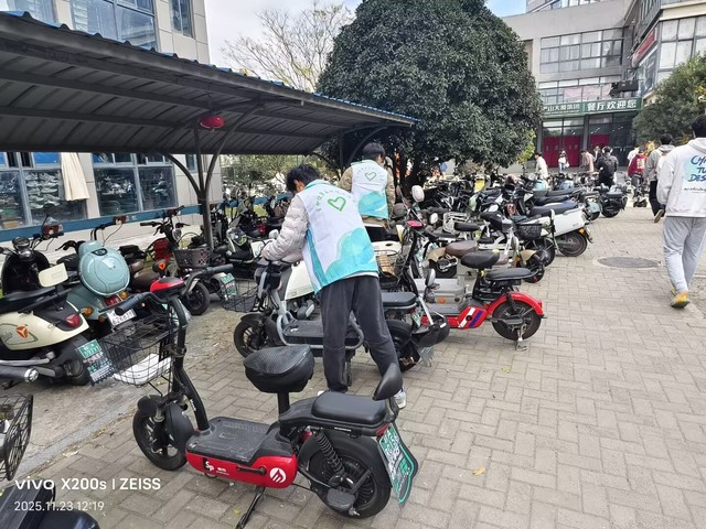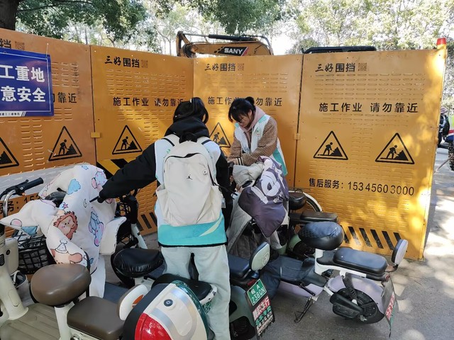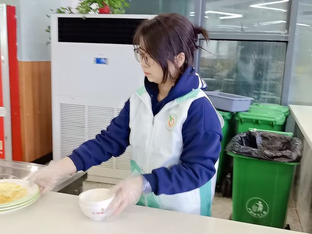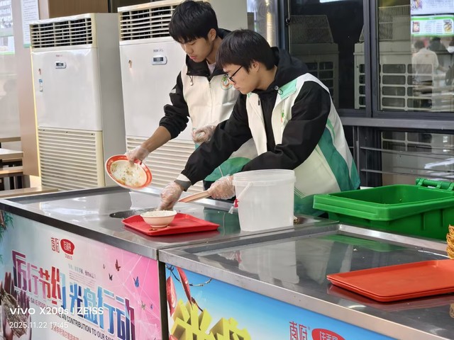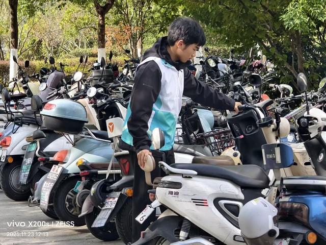 活动期间,食堂服务现场暖意满满。二期、三期食堂内,志愿者们准时到岗,主动引导同学们有序排队就餐,耐心提醒按需取餐、践行“光盘行动”,同时协助整理餐桌杂物,及时劝阻不文明就餐行为。在志愿者的示范带动下,同学们自觉遵守就餐秩序,剩饭剩菜明显减少,文明就餐、节约粮食的氛围愈发浓厚,食堂环境始终保持整洁有序。校园交通秩序整治同步推进。男女宿舍楼下,志愿者们化身校园秩序守护者,认真引导同学们将非机动车规范停放在指定区域,对零散停放、占用通道的车辆逐一整理归位,同时向过往同学讲解规范停车的重要性,提醒大家自觉维护校园交通环境。经过两天的细致服务,宿舍周边车辆停放杂乱的问题得到有效改善,校园通行路径更加顺畅,既保障了师生出行安全,也让校园环境更显规整。