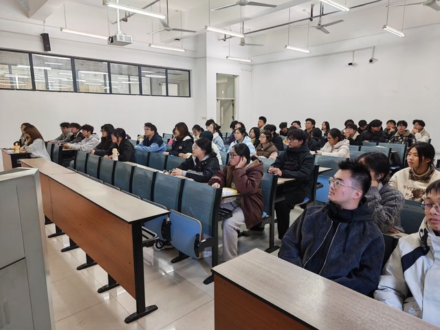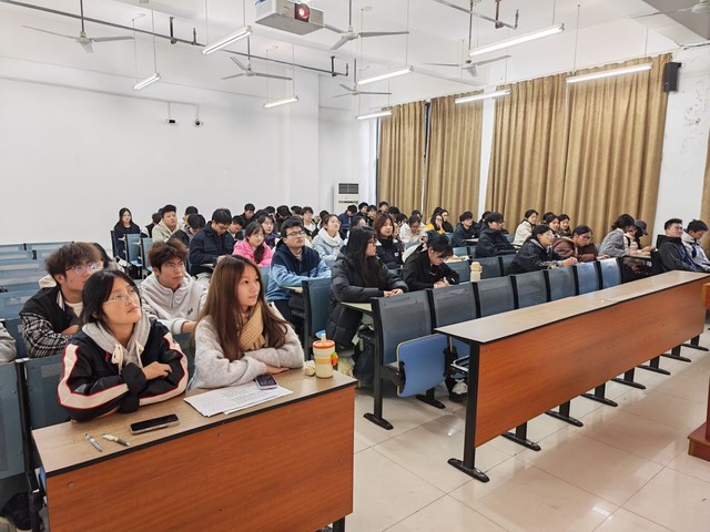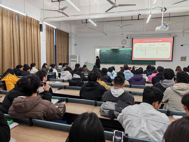 课程伊始,组织部主席郑启桂首先阐述了从严治团的重要时代背景与政策要求,并且教室内投影屏幕清晰展示了“从严治团为何成为时代必答题”的核心议题,并围绕“政策要求”、“高校党建(团建)困境”、“共同富裕”等关键内容进行了深入解读。随后结合现实案例,分析了当前共青团工作面临的挑战与机遇,强调了从严治团是保持组织先进性、提升组织力的必然要求。课堂上,学员们精神饱满,专注聆听。尽管时值冬日,大家衣着厚实,但热情不减。有的学员认真记录笔记,有的凝神思考,有的则用手机拍下课件重点,展现了青马班学员严谨认真的学习态度和积极向上的精神风貌。整个讲座内容翔实,逻辑清晰,既有理论高度,又紧密联系高校共青团工作实际,引发了学员们的深入思考和共鸣。
