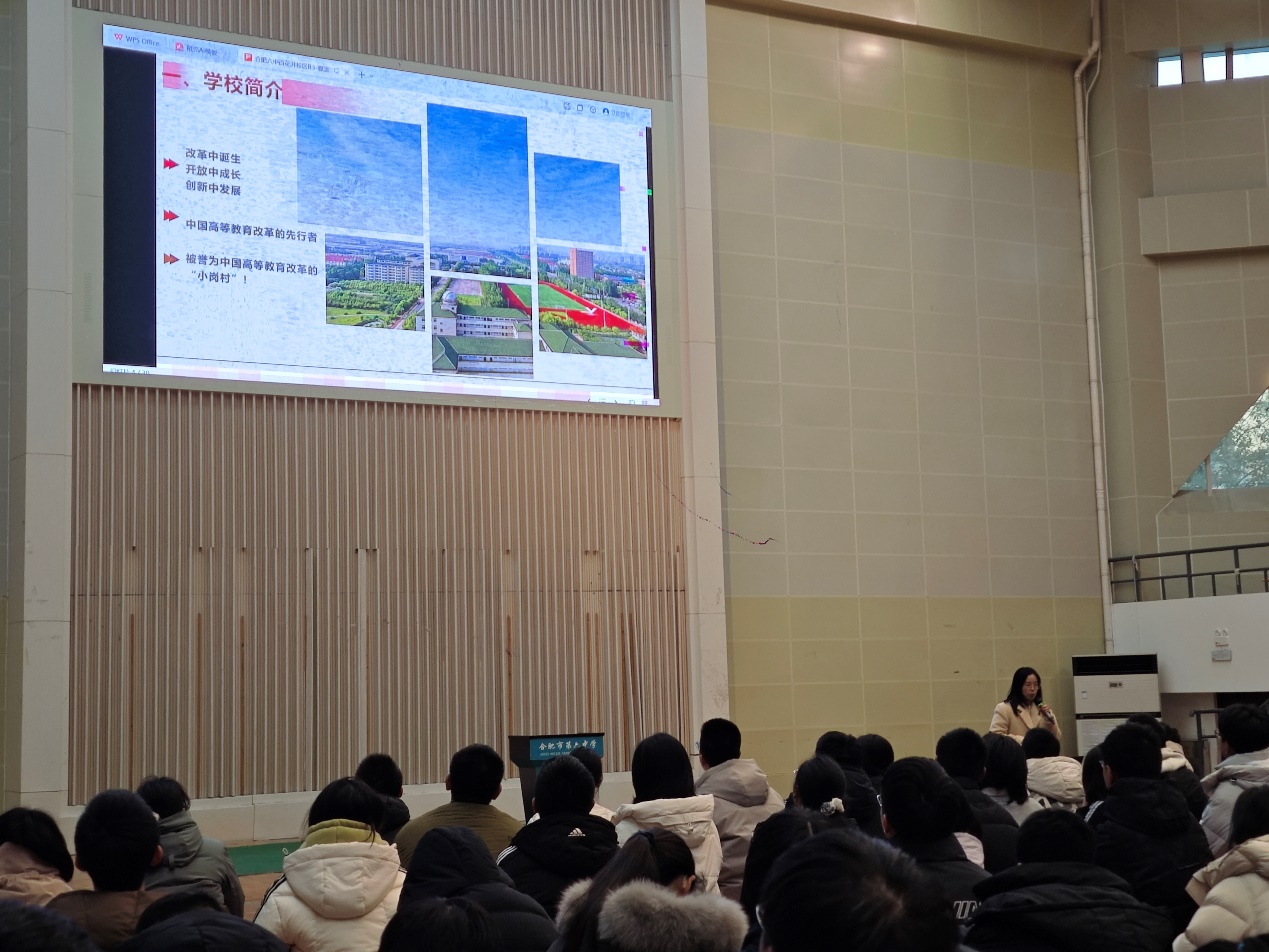 为响应学校招生宣传工作,拓宽本科生生源,2026年1月21日,合肥大学生命健康与环境工程学院教学副院长夏潇潇和教师范迪前往合肥市第六中学百花井校区开展招生宣传工作。六中年级部负责人邓中亚和团委副书记王楷文热情接待,校区400余名学生参与活动。
