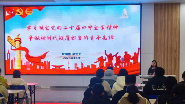 12月12日,我校第六期“菁英班”第三次专题授课在大学生活动中心北楼206室举行。本次课程以“学习领会党的二十届四中全会精神,争做新时代挺膺担当的青年先锋”为主题,由校团委书记李妍妍主讲。