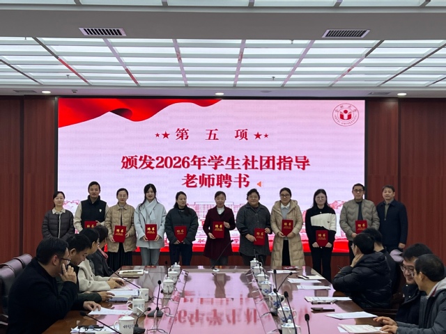 12月30日上午,2026年学生社团指导老师聘任大会在大学生活动中心会议室举行。党委常委、副校长白义香出席会议并讲话,宣传部、学生处、团委等部门负责人,全体受聘社团指导老师及社团学生代表参加会议。