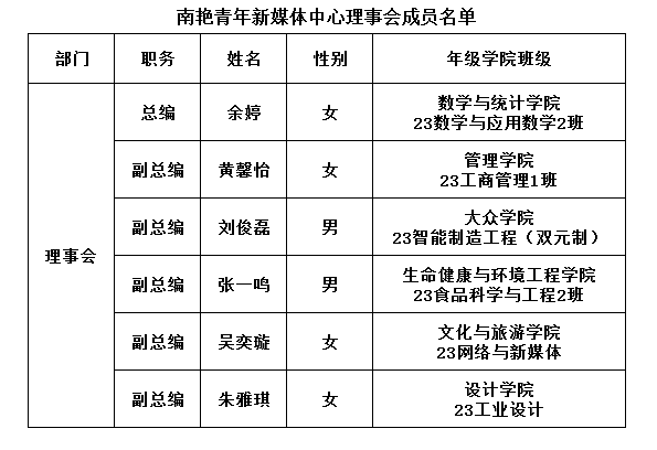南艳青年新媒体中心设理事会,理事会下设办公室、信息部、数字部、新闻部、视媒部、设计部六个部门。理事会设总编、副总编,各部门设分管总编、主编、编辑、实习小编。